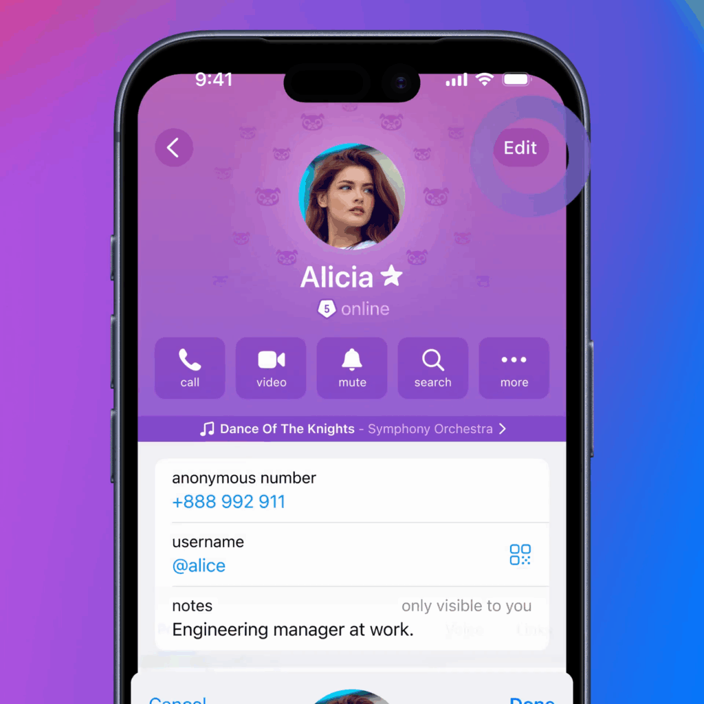 สำหรับสมาชิก Telegram Premium ตอนนี้สามารถปรับแต่งสีสันของโปรไฟล์ตัวเองได้ง่ายขึ้นจากหน้า Settings หลัก และยังสามารถเลือกใช้พื้นหลังและสัญลักษณ์จาก “ของขวัญ (Gift)” ที่เรามี มาตกแต่งหน้าโปรไฟล์ให้ไม่เหมือนใครได้อีกด้วย