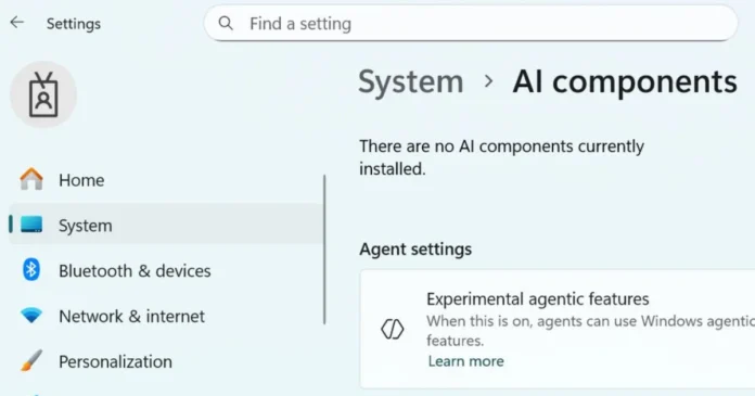 [Image showing the new Windows 11 AI components toggle for “Experimental agentic features”]