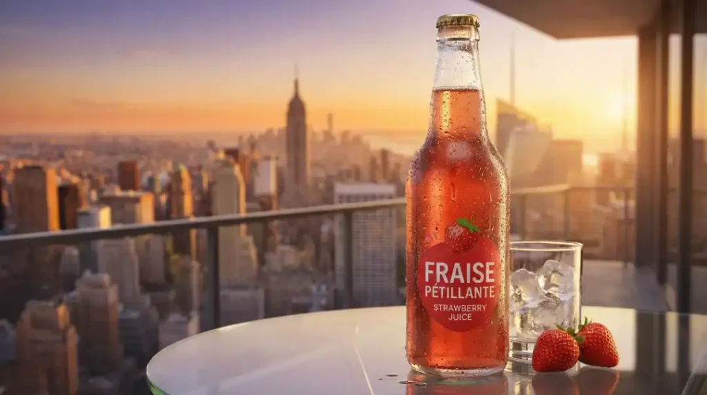 A photorealistic advertising shot of a sparkling strawberry juice bottle on a glass table of a high-rise balcony, sunset city skyline background, golden hour lighting, condensation dripping, luxury lifestyle vibe, sharp focus on the bottle, cinematic bokeh.