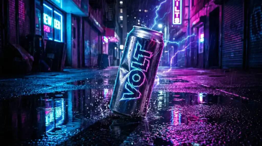 An edgy advertising shot of an energy drink can, dark urban alley with neon cyan and magenta lights, puddles reflecting neon signs, dramatic shadows, water splashes, high dynamic range, hyper-realistic textures, vibrant electric atmosphere.